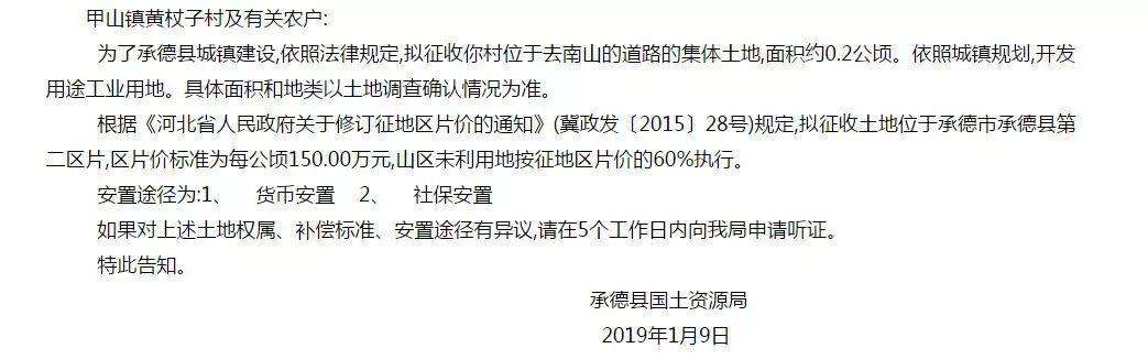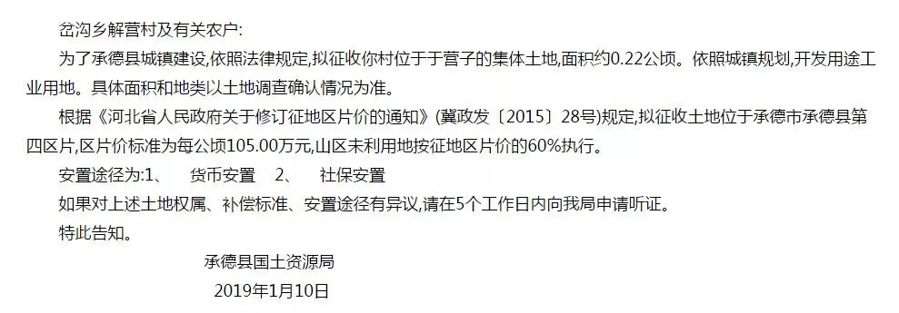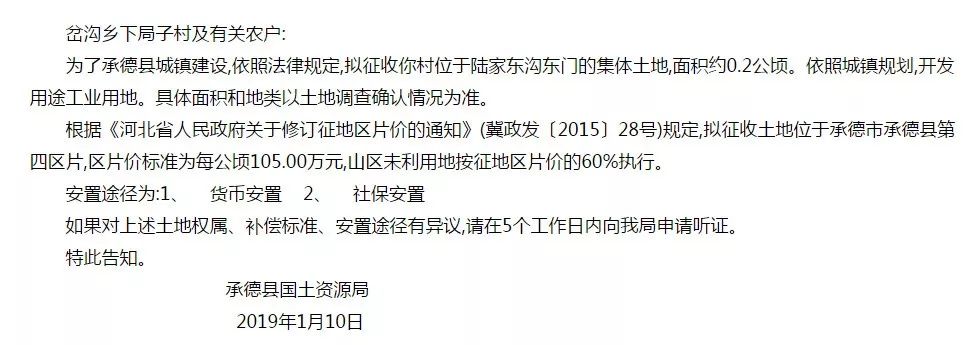 重磅消息来了!承德又有大拆迁了!贴吧菌赶紧跟大家分享:承德县人民政府官方网站发布了《征地告知书》!本次征收土地涉及6个村6块土地,共计4.88公顷!
