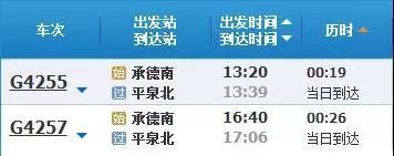 承德南-平泉北(65km)运行时间为20分钟左右,特等座票价57元,一等座票价51元,二等座票价32元。