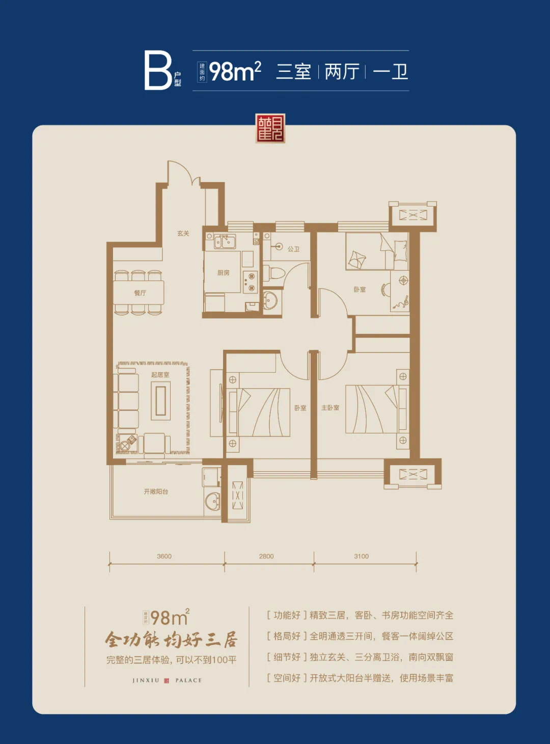 全功能 均好三居B98㎡的均好三居,户型方正,便于规划,装修零烦恼。三开间朝阳的设计,实现了整体房间的较大采光度,且全室明窗,无暗室,更显干净整洁。独立入户玄关,给主人留下个性化设计的空间,南向双飘窗,帮助主人实现有效的空间扩展,不足百平的面积足以打造出高端体验。