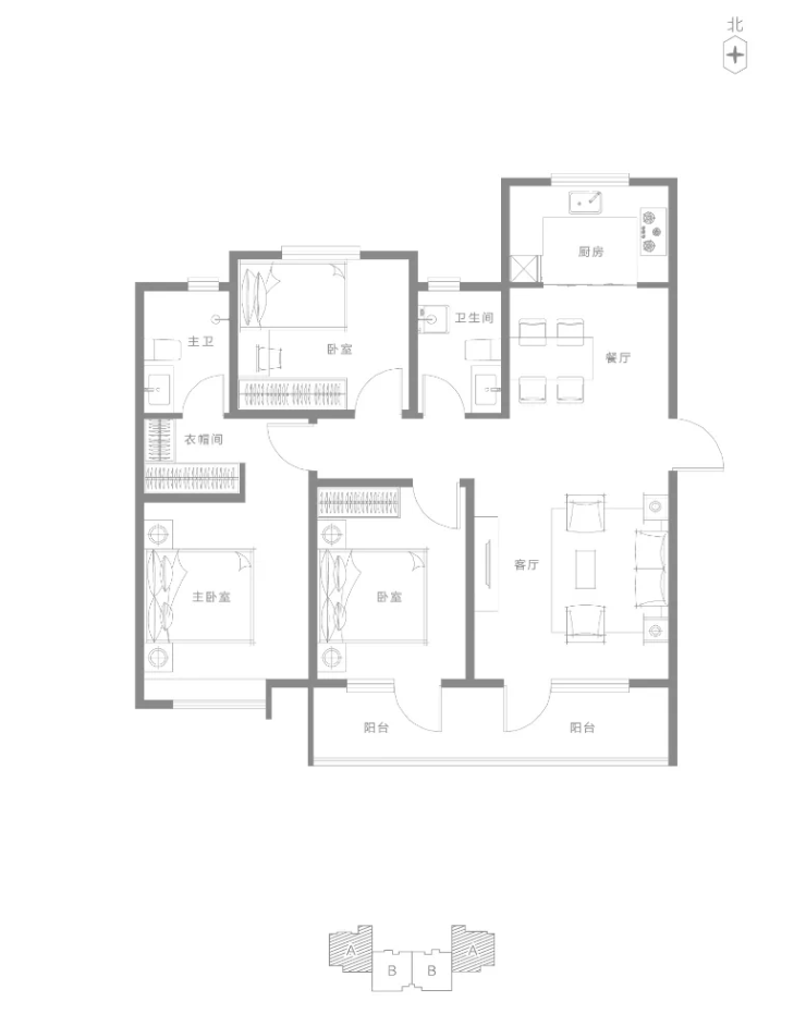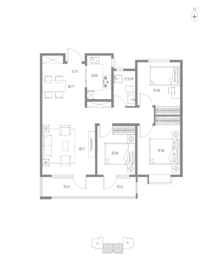 祥云·红创悦府建面约125㎡三室两厅两卫户型,南北通透,视野宽阔,通风采光效果更佳;格局方正;联通双阳台设计,动静分明,无论是南向观景会客,还是北向生活学习,都非常惬意。