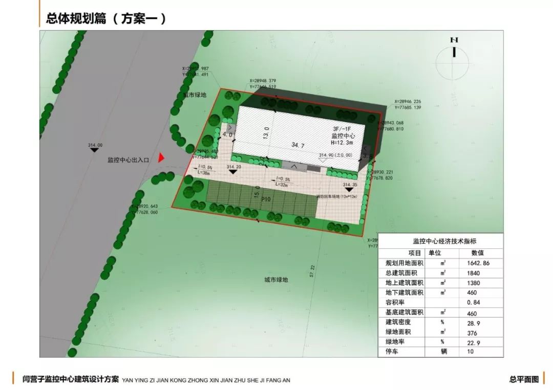方案一:总建筑面积1840平方米,容积率0.84,建筑密度28.9%,绿地率22.9%。