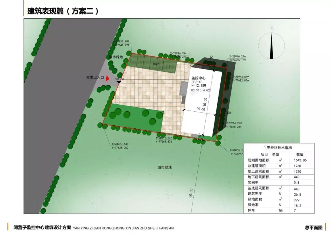 方案二:总建筑面积1760平方米,容积率0.8,建筑密度26.8%,绿地率18.2%。