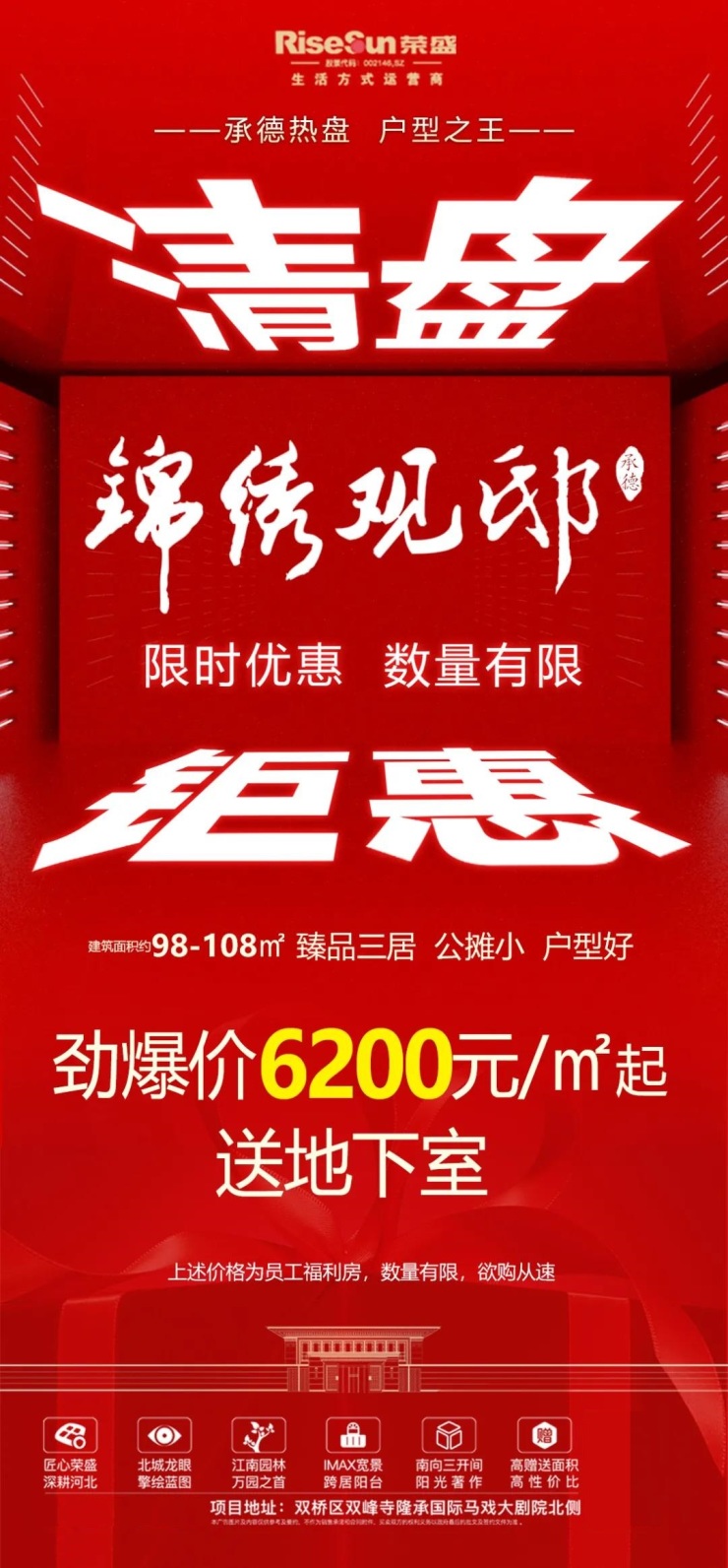 限时特惠 数量有限 力度较大 清盘价 6200元/㎡起 购房即 送地下室 ———————————————————— 清盘钜惠 把握机会 人们常说 一生中一定不要错过—— 回家的末班车以及爱您的人 现在 还有两件事您同样不能错过 一件是如约而至的好房子 一件是荣盛·锦绣观邸清盘钜惠价 最后房源 何