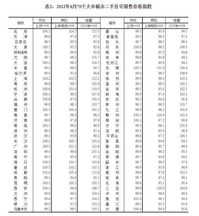 2022年6月70个大中城市二手住宅销售价格指数。 截图自国家统计局官网