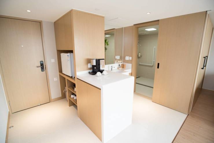 大家的家·北京友谊城心社区设有389间居室,房间地面都铺有防滑地胶,扶手是进口的尼龙抗菌扶手;卫生间采用折叠扶手、防滑地面、浴凳,24小时恒温热水;所有房间都配备智能马桶,卫生间的门上特别设计了观察窗;每个房间都配备冰箱、洗衣机、操作台;室内的家具和墙角都是无棱角设计;家居系统可以语音控制;取暖采用中央空调,房间内温度可自由调节;室内灯具和灯光采用防眩光灯罩设计;步入式储物间,既可以存放东西,也可以当衣柜使用;卧室床前、客厅都设有紧急呼叫装置;卧室内床的高度大约是45cm,便于年纪大的住户上下床,床垫选择了适合老年人使用的、有一定硬度的床垫。