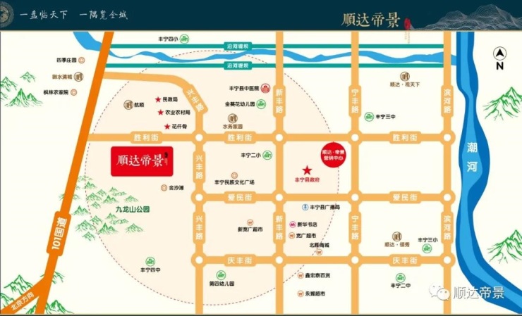 位踞丰宁名山-九龙山下,胜利西街与111国道交叉路口处(水务家园西行南至九龙山,北至胜利街,西邻城市公园,东至兴丰路。项目位居全城地势高点,为老城核心较佳区位,向西背靠龙山,向东御览全城,项目中心米辐射圈内,无大型建筑,城市配套完善,为丰宁城区不可复制的经典地块,融衣、食、住、行、科、教、文、卫、体等于一体,是尽显尊贵,极尽便利的黄金地段。