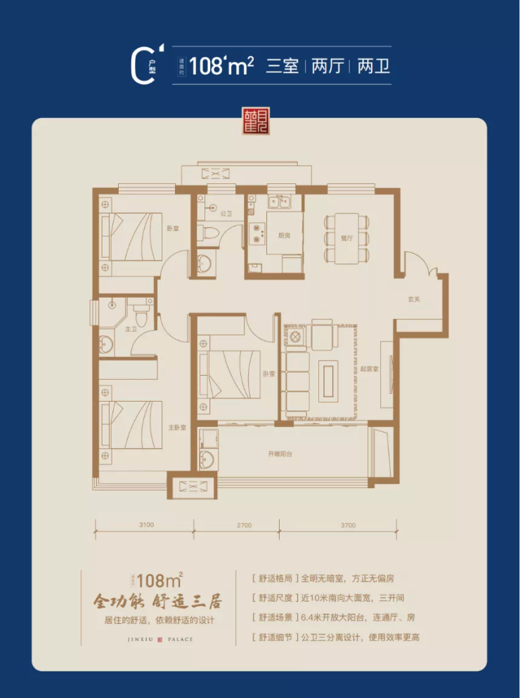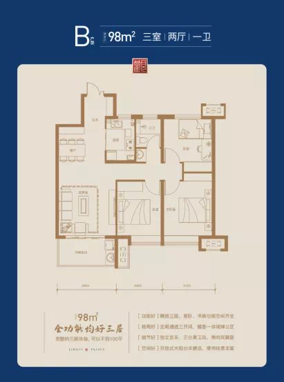锦绣观邸排名前列主力户型,109三居,精研承德高端家庭生活需要和居住习惯,打造适中面积、轻奢空间、细节关照的舒适三居。