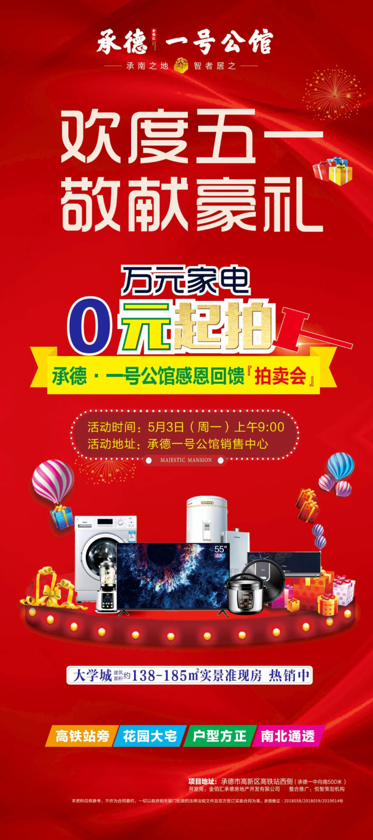 【承德一号公馆】 欢度五一,敬献好礼 5月3日上午9:00 万元家电,0元起拍 电视/空调/洗衣机等更多大礼 大学城138-185㎡洋房热销中