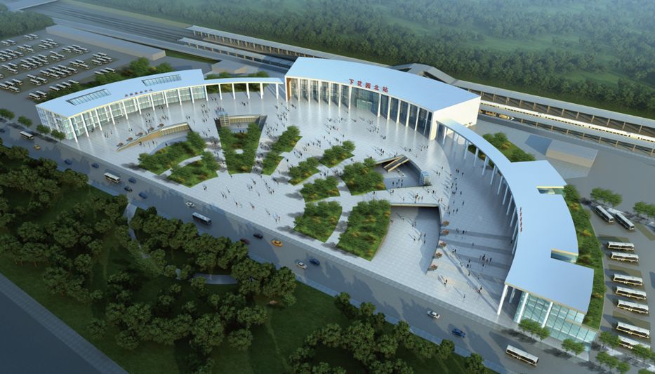 站房整体设计延展、舒适。线条运用简洁明快。站房前的花型柱廊表达了“花园新城”东花园镇的含苞待放之势。